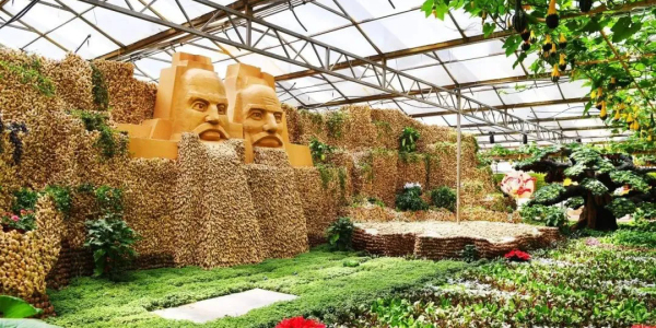 以“新时代大美中国的壮丽画卷”为主题,以长江、黄河、长城、长征、大运河五大国·家文化公园为路线,运用蔬菜、瓜果、粮种等元素,采用雕刻、挂果、粘贴、扦插、彩绘等艺术手法,精心打造“大美中国”“鱼跃龙门”“江山多娇”等景观100多处,充分展现蔬菜与文化融合的魅力,气势恢宏,寓意深远,涤荡心灵,弘扬正气。